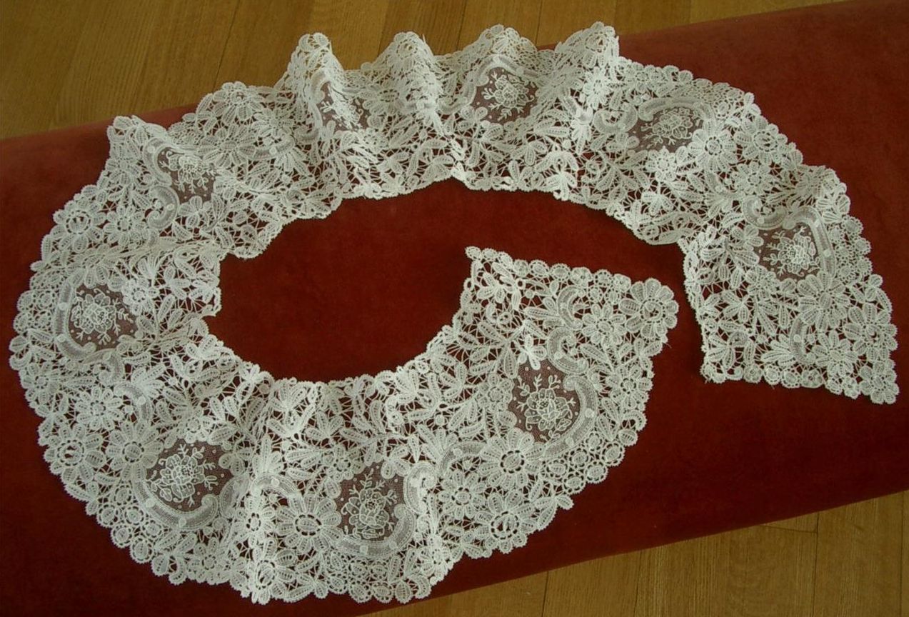 Comments: Not the greatest design on this Duchesse set, but the fact that the collar and cuffs have survived together is unusual. And I like the very dense workmanship in the motifs. The yellowing at the inner edge of the collar is due to the fact that a tape has been sewn in – there doesn’t seem to be any damage.