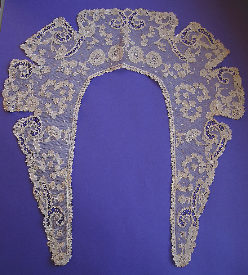 Comments: Good bertha of Duchesse de Bruxelles. Design of flowers, leaves, swags is quite typical of this style. Not a very ambitious piece, but appears in good condition (seller sites a few tiny breaks and some age discoloration).