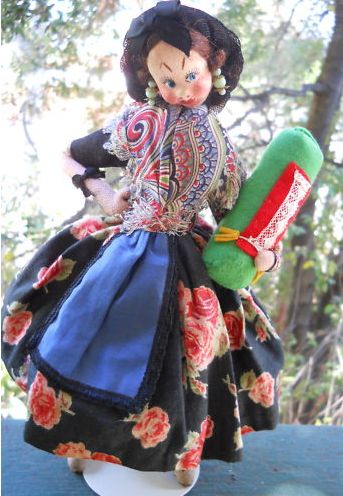 Comments: Spanish molded felt lacemaker by Klumpe (note the tag on the back of the skirt). Note the inverted V shaped eyebrows – a characteristic of Klumpe. Looks in excellent shape.