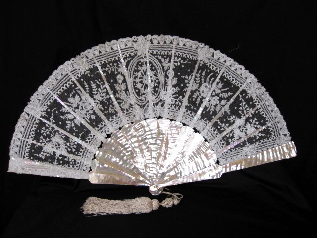 Comments: Brussels applique on machine net fan leaf, attached to mother of pearl sticks. Some breakage in the sticks, but leaf appears ok, seller says it’s ‘a little grubby’. Has original tassel and box. It’s probably just the photo, but the MOP is a little bright, overpowers the lace a bit. Usually you see MOP with Duchesse leaves; this one is a little unusual.