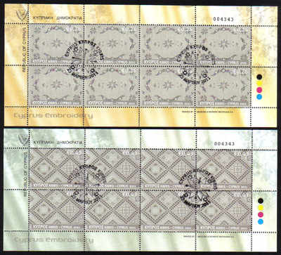 After a big marketing push for their embroideries in the late 1890’s, Lefkara cutwork appears to have evolved in the 1920’s and 30’s – the piece shown in the first stamp was made in the 1950’s. Lefkartika work was included in UNESCO’s representative List of Intangible Culture Heritage of Humanity on September 30, 2009. See http://www.lefkara.org.cy/HandmadeLace/tabid/56/language/en-US/Default.aspx for a good discussion Lefkara embroideries.