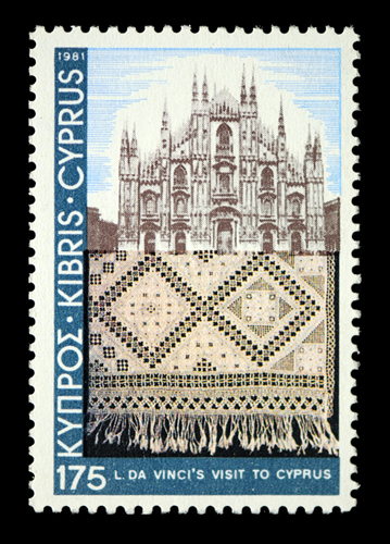 Legend has it that Leonardo da Vinci visited Lefkara in 1481 and bought a lace altercloth for the cathedral in Milan. Two small problems – even this kind of cutwork lace didn’t exist in 1481 (it was probably a ‘potamos’ embroidery), and there are no official records of any da Vinci visit to Cyprus at all. Nevertheless, Cyprus issued a set of postage stamps in 1981 honoring the 500th anniversary of visit and the lace, and a new stamp was issued in March of 2011: