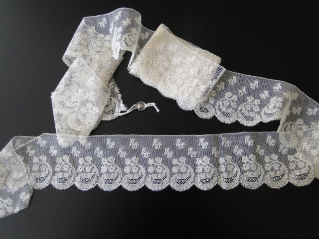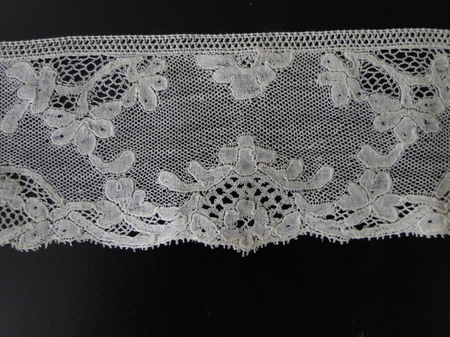 Comments: Border of 18th c Mechlin. The mesh is a little denser than the previous example – a sign of the linen thread. Design is OK, but not particularly exciting, although there are some varied fillings. Condition looks good, note one join.