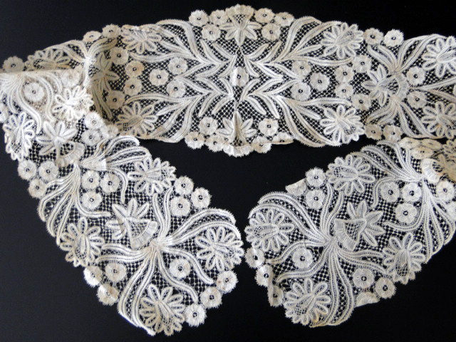 Comments: The condition of this piece isn’t the best – numerous small holes in the net. But the bobbinlace motifs appliqued onto machine net are lovely. They have a few simple needlelace fillings.