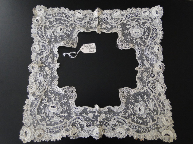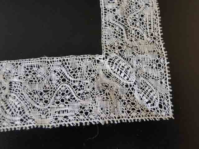 Comments: Border of Mechlin – note the metal tag which was often used by lace retailers. This one doesn’t appear to say anything. But it probably means the piece was unused. Nicely worked design, I don’t see any damage from the photos.