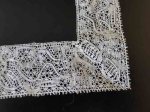 Comments: Nice to see a handkerchief edge without a center. You can concentrate more on the lace. This point de gaze border is rather conventional with raised petal roses – motifs look a little blocky. Fillings look like they are there only because they have to be. Condition looks very good, I can’t spot any obvious damage or spots.