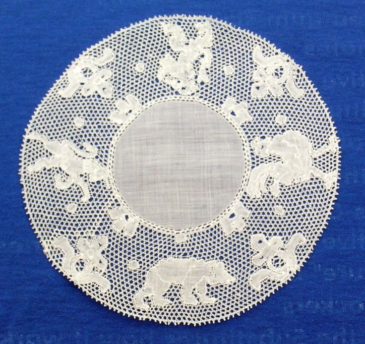 Comments: This seller has a number of small circular mats for sale this week, be sure to take a look (350463449884 is quite nice). The most interesting is the Belgian Point de Paris War Lace piece, with English, French, Belgian and Russian symbols. The seller has an interesting writeup. Belgian lacemaking was supported throughout WWI, with the result that the government owned large quantities of lace at the end of the war. Few pieces found today have the very obvious symbolism of this small mat. I’d recommend two books on this period, Charlotte Kellogg’s “Bobbins of Belgium, A Book of Belgian Lace, Lace-workers, Lace-schools and Lace-villages” (1920, one of my all-time favorites), and the much newer book by Kerry and Carol Brooksbank, “The Story of “Ma’s” Laces, 1914-1918, Her response to the trauma of wartime” (2004).