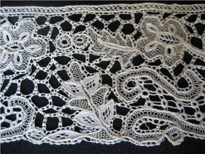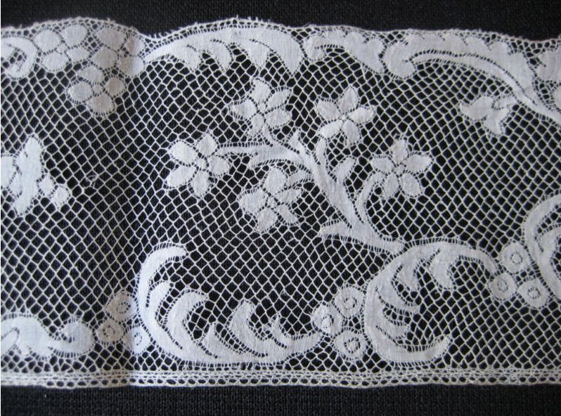 Comments: The clothwork on this piece is amazingly dense and contrasts beautifully with the square mesh. Valencienne borders like this really don’t get the respect they deserve – this was a difficult lace to make, but people look at it and tend to think ‘undergaments’. And let’s face it, some of this was made with more speed than care. But a piece like this recalls so much of the great 2nd half 18th century ‘line drawing’ Valenciennes – in my opinion some of the finest lace ever made.This one has one join, and a little fraying on the picot edge, otherwise looks good.