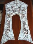 Comments: 19th century joined lappets of Belgian needlelace. Call it point de gaze if you like – this is more a modern term although it is widely used. The label ‘Point a l’aiguille’ is found in contemporary catalogues. This is a nice intact piece – fairly simple work with no separate petals on the flowers. Looks like a few small holes in the net, and a lot of staining on the outer edges. Should come out nicely with a proper cleaning.