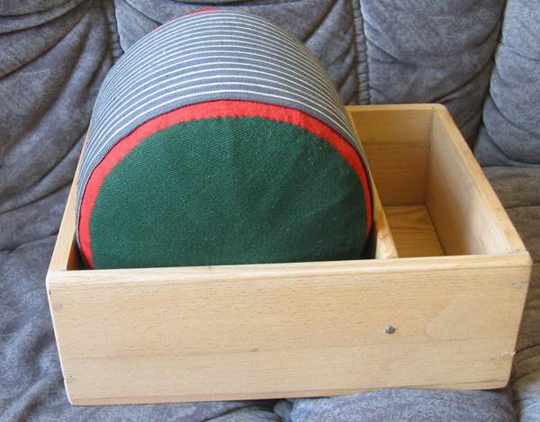 Comments: Traditional Dalarna lace pillow. The stripes on the pillow are to guide the lacemaker because this is meant for a freehand lace. I have no idea how old this is, usually they have wonderful woodworking joints. This one has some screws holding the divider piece in. A pillow like this is used with straight juniper bobbins with a handcarved indent for the thread. (more modern machine ones are now available). Unfortunately no bobbins with this one – the division at the back is used for bobbin storage. The accompanying book is excellent. These pillows are very hard to find, and this one comes directly from Dalarna.