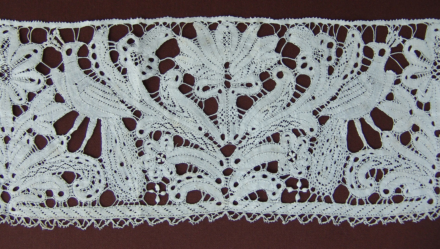 Milanese lacemakers carefully developed or adapted techniques to fit the current fashion. The earliest Milanese designs appear to date from around the mid 17th century, and bear a close resemblance to the contemporary flat and gros point needelaces of Venice. Some examples include extensive raised work meant to imitate the sculpted edges of Gros Point. Milanese lace is now considered a tape lace, but it came at a time when lace motifs were starting to break up into small pieces. Many early pieced laces, particularly from England, still retain their continuous tape origins. Note the birds in this month’s selection – are they tape or pieced? Tape laces in much lighter linen thread were also made at roughly the same time in Flemish work. It does appear that subsequent Milanese took a more purely tape lace route while the breakup into discrete motifs was developed further in northern Europe (although early works such as the 1599 footbench cover made for Archduke Albrecht and his wife Isabel of the Netherlands demonstrate that figural bobbinlaces were already well under development before Milanese really got started). Here is where most of the confusion lies – many different tape laces developed from this base and spread to a number of countries, especially Eastern Europe and Russia. It is not easy to tell them all apart.