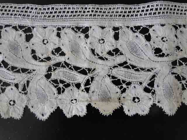 Comments: One could probably call this a Duchesse piece, but there are a lot of variations in this type of Belgian pieced work. The technique is quite dense, and note the small windows in the petals and leaves – this is often associated with laces named ‘Point de Milan’. Perhaps reflecting a Milanese tape lace inspiration. These usually have a mesh ground, so this one with a bride ground remains to be positively identified.