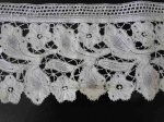 Comments: I’ll hazard a guess that this is Belgian because of the raised edges on some of the motifs. It’s a tape lace starting to break up into discrete motifs. You sometimes seel laces like this with an early mesh ground. A little damage to the header, but a very interesting piece.