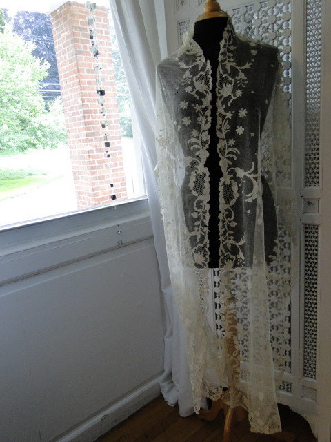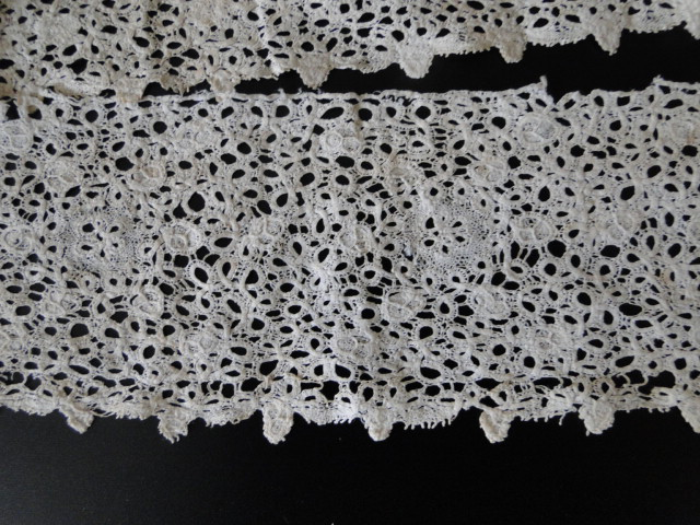 Comments: Black silk guipures come from a number of places – this one might be Le Puy. It has some fascinating fillings, along with a point ground mesh. Some minor defects – and it’s a really long piece. Just wish there were a photo showing a section of the entire piece.