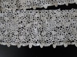 Comments: Good typical flounce of Duchesse de Bruxelles – Duchesse bobbinlace motifs combined with Point de Gaze needlelace inserts. Simple raised petal rose in the needlelace. Design is very conventional – a good basic example.