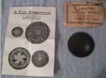 Comments: Round Proctor Teneriffe Lace Wheel. Patented in 1903 by Augusta Proctor of Viroqua, Wisconsin, this listing includes an instruction booklet and part of the original packaging. This black gutta percha wheel (which also came in a square form) is meant to be pinned to a small sawdust stuffed pillow. The black The motif is woven around the pins. Very rarely you can find the pillow – the wheel itself doesn’t come up all that often in good shape, like this one.