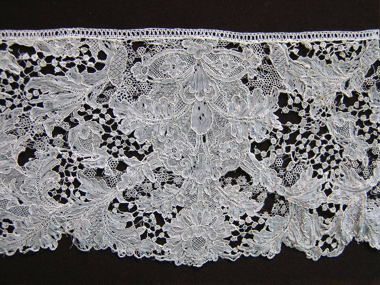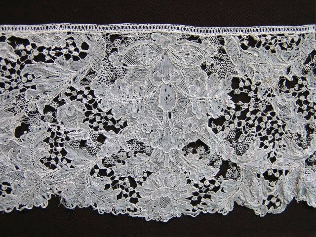 So where exactly did this piece come from? Often such dense patterned fine needlelaces are given the name Sedan, without a lot of reasoning behind the choice. Palliser discusses the question, mentioning the opinions of several authors. Sedan itself was known for its cutworks well before the Royal edict – and it is unclear how the needlelace of the area developed. Some consider it a variation of Alençon, some a variation of contemporary Flemish flat needlelaces. By 1752 most authors agree that the Sedan lace quality had fallen to be of little value, and by the revolution, the entire industry had vanished.  Séguin states that the Sedan lace is inferior to Point de Venise à Réseau, although who knows what he means by that? The Venetian flat needlelaces were vastly inferior to contemporary Belgian examples, and at this time both were known as Point de Venise à Réseau. That misnomer applied to the magnificent early 18th century Belgian flat needlelace is still in evidence today.  Lefébure considers Sedan lace as a variant of Alençon, and it seems to me that the pattern of this piece bears a lot of similarity to later Alençon floral designs. Others think it was a Belgian product of Brabant or even Liège.  And the attribution of Sedan also seems to apply to several cities in the Champagne area. Most authors agree that the proximity to Flanders made extraordinarly fine thread available to the lacemakers, both in size and whiteness.
