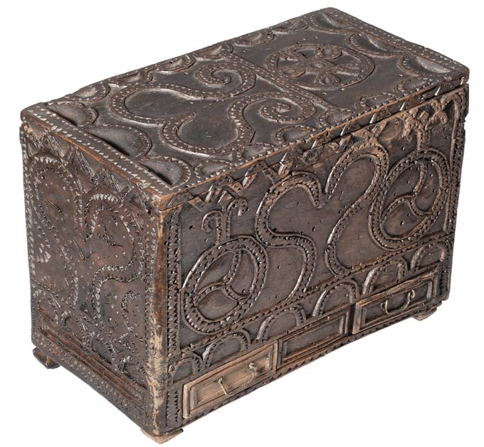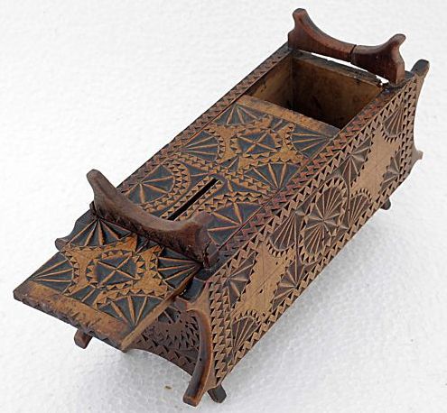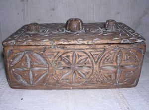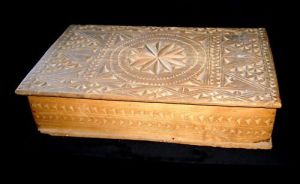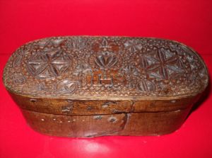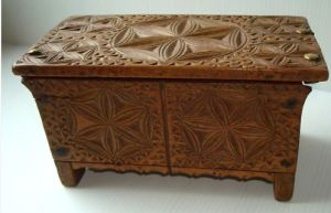 Turning now to something different – the next series of figures show boxes which a lacemaker could use to store equipment. These developed extensively in France where they served as prime media for chip carving decoration. In French they are often called ‘boites’ and ‘coffrets’. Again, buyer beware – these are often reproduced and faked. To what extent these were actually used by lacemakers is unknown. Examples are shown in Figures 13 and 14.