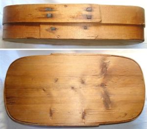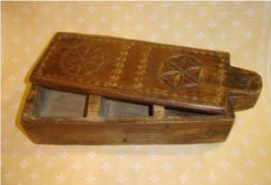 Another type of lacemaker’s box from France strongly resembles the American Shaker oval box. The first example in Figure 15 is elaborately decorated in with chip carving. The second example is a more typical plain wood arrangement.