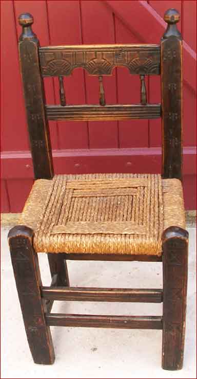 This is a wonderful collecting area, primarily because of the carved decoration often found in French provincial furniture. For example, Figure 1 shows a recognized example of a French lacemaker’s chair by a known artist. Chairs like this are generally low (to keep the knees up) with a high back, and carved as to be seen from both the front and back. Note the woven seat. They were usually made by a husband for his wife, or by a fiancé. The sunburst pattern on this chair might be taken as representing a lacemaker’s pillow, but it’s not altogether convincing. Note that the lighter wood in this example is typical of the Le Puy and Auvergne areas.
