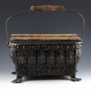 In England an interesting footwarmer known as the ‘dickey pot’ developed, as seen in Figure 12. The stoneware pot holds the coals, and an elaborate wooden structure supports the feet.