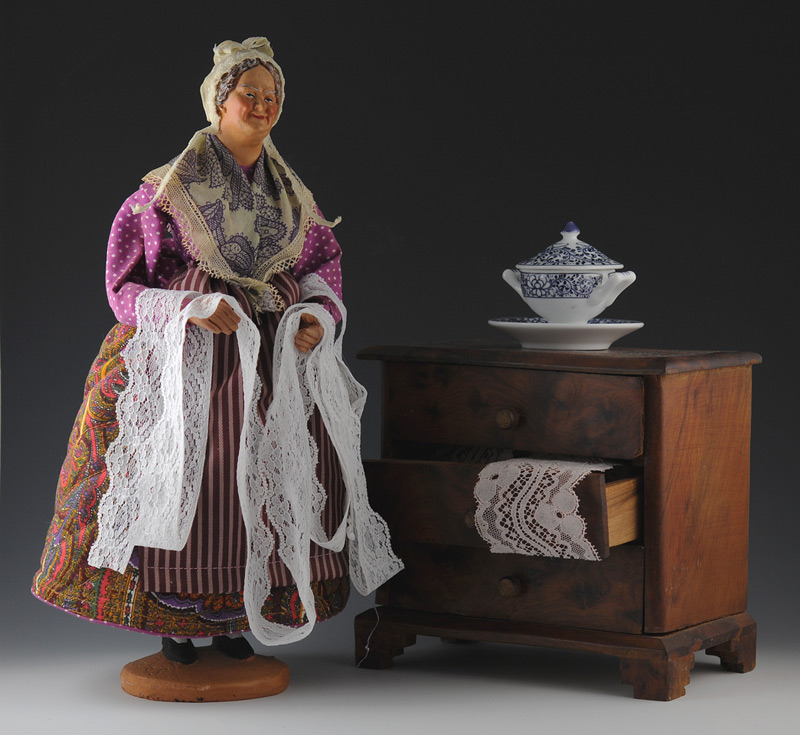 To finish I would like to mention one more furniture form, the “lacemaker’s chest”. This small chest of drawers seems to be more common in France. Note the Santon Lace Merchant in Figure 18 with a chest to store her laces – it shows the approximate proportions of such an item. Figure 18 also shows a modern interpretation by the Drexel Heritage Company from their Tuscany collection.