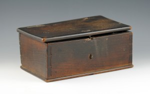 Right: Bobbin box purchased from the Springett collection. The lid is held on by wire hinges, one of which is missing. The front clasp is also broken. It measures 6-5/8″ long, 4″ wide, 3-1/2″ high.
