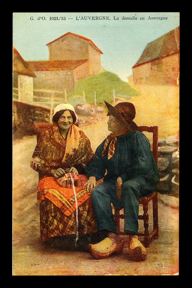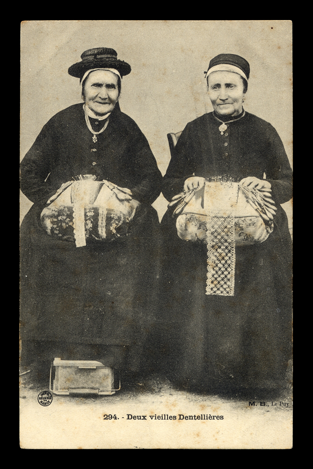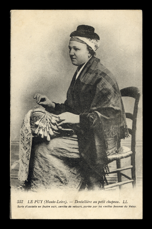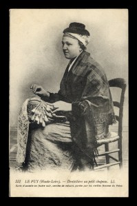 Top Left: Postcard of Lacemakers, probably from Le Puy. One is using a chauferette.