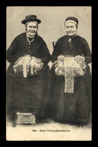 With the exception of the foot supports and some well documented chairs and small pieces, the label of “lacemaker” attached to the items discussed in this article should be taken with caution. Be especially careful of the boxes. Lacemakers certainly did need places to put things, and it is not unreasonable to assume the names now attached to these items have good solid origins. But there is little documented evidence, particularly in the postcard photographic record. Nonetheless, they can be a wonderful (though often faked) collecting area.