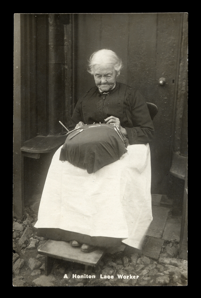 Right: Postcard of a Honiton lacemaker using a footstool. Foot support was not needed by lacemakers in England and Belgium who normally used a stand. Honiton workers seem to be the only ones using footstools in England.