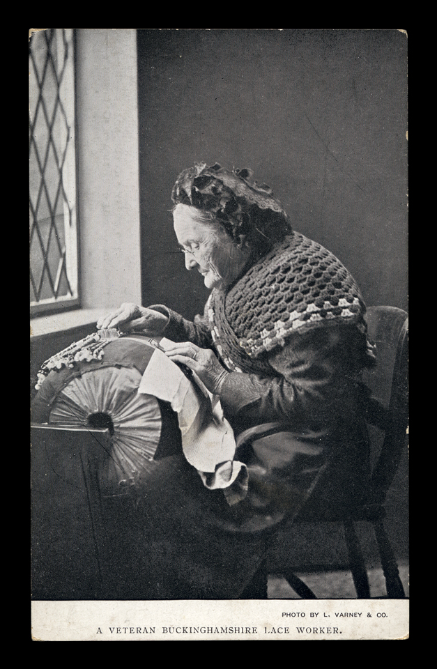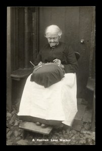 As for chairs, I find this an interesting subject, and one that has not previously been investigated. Spinners and other trades have a recognized chair style; why should lacemakers be any different, especially in a large local industry? If you look at a number of photos certain trends start appearing, for example, the low chair to keep the knees high seems to be a common element. Then again, when have any of us ever looked at the chair itself in the photo of a lacemaker? Maybe there is something to learn in taking a hard look at supposedly ordinary objects. Something that might have been forgotten when today we can just go to any furniture store and buy a chair.