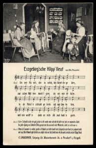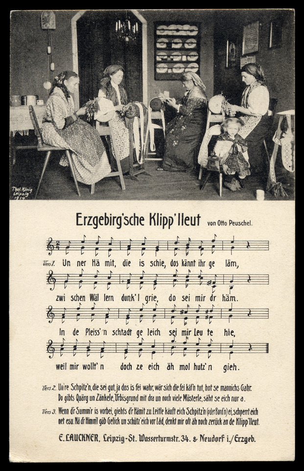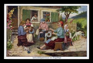 Figure 6. Two German postcards showing lacemaking scenes, although it is difficult to vouch for their strict accuracy. The lefthand card shows the use of stools with the köppelstand. The righthand card shows chairs not dissimilar to what is now known as a “spinner’s chair” among modern handspinners.