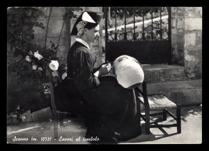 The lacemakers of all countries need something to sit on. Note the extremely low chair shown in the postcard of Figure 4 from Scanno in Italy. This small chair keeps the lacemaker’s knees very high, and a second chair is used to support the pillow.