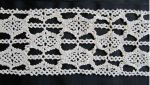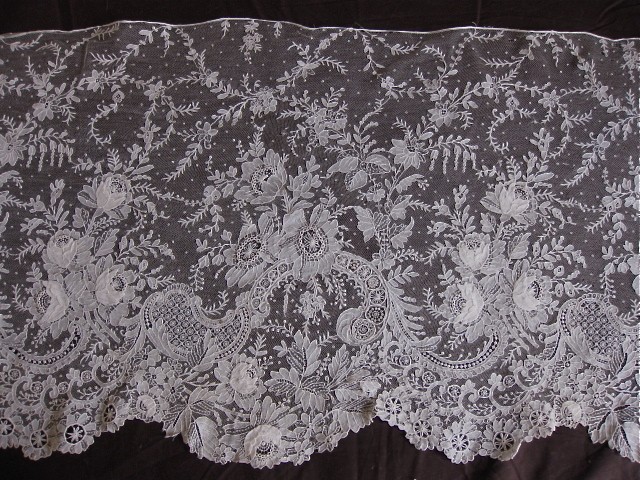 Comments: A Duchesse de Bruxelles variation. Bobbinlace motifs are above average in design for this kind of lace, and have some raised work in the veining. Needlelace is limited to some reseau and ring fillings inside bobbinlace motifs. Nice, unusual piece. A little damage to some of the needlelace net, a few broken brides, but overall good condition.