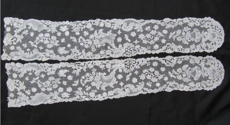 Comments: Great set of mid 18th century lappets. Dense pattern with good bobbinlace fillings. Vrai droschel surrounds all motifs, tied into the motifs – this is not an applique. The design includes some small birds and butterflies. I’m not sure why the seller calls these English – Belgian is certainly an option. They look in great condition, only very minor pulls in the ground. I’m thinking they might be cut a bit short – the ends are ragged but it’s hard to tell if anything is missing from the design.