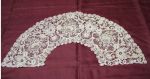 Comments: Duchesse de Bruxelles fan leaf. Good larged double raised petal roses in the needlelace. The bobbinlace doesn’t have any raised work, seems a bit on the Brugges sides. Fairly conventional design. Very good condition, I don’t see any problems. Seller cites a few minor pulls.