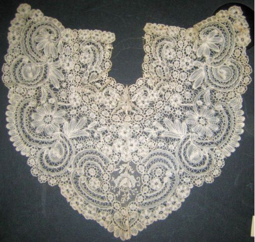 Comments: Good Duchesse de Bruxelles collar with an attached neckpiece. Raised rose petals in the front needlelace insert. Nice dense design. A few brown spots, but overall good condition.