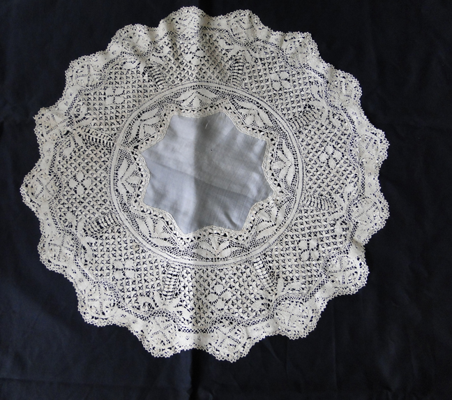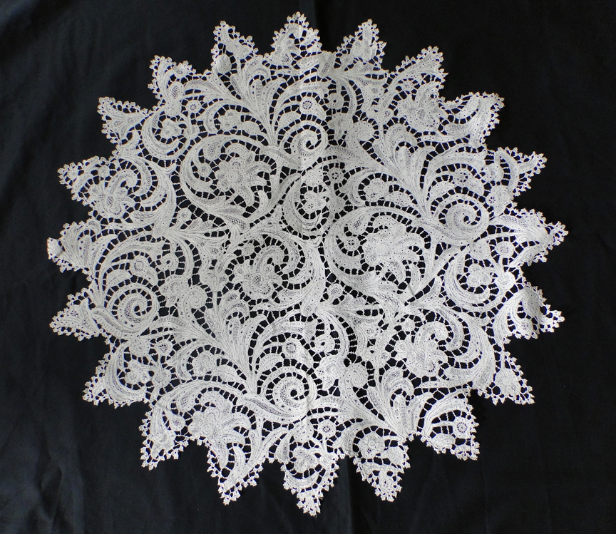 Comments: An impressive looking piece – wonderfully complex ground and good guipure motifs. The work seems to be quite fine in contrast to the normally sized Maltese pieces. Seller cites a few pulls and discoloration, but overall looks in very good condition. Note the added detail of the leaves fitted in a circle around the center cloth. In fashion, couture emphasizes detail – beautifully found in this piece.