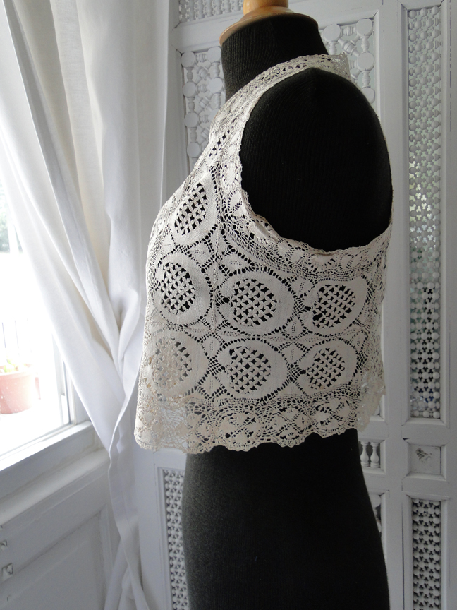 Offered by: Maria Niforos, Ebay seller mithya, London-New York, United States Comments: Excellent Maltese Bolero or vest, with large areas of Guipure and leaf fillings. This fitted garment is unusual for Maltese. Looks in very good condition, no damage I can see. Wish there were a photo of the front. This is a much cleaner, simpler piece than the previous collar.