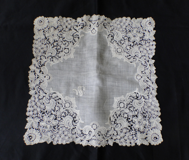 Comments: Good Duchesse handkerchief, no needlelace insertions. Some raised work on a half-stitch background in the flowers, with simple bride ground. The pattern seems mainly to be grapes and leaves. Cloth has a good embroidered ‘S’ monogram. Som slight staining, few pinhole openings, basically very good condition.