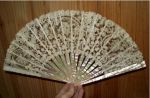 Comments: This beautiful piece of lace has been done to death by ostentatious ornamentation. I’d be surprised if that was the original intent. A tragedy, beacause the lovely, high quality Point d’Angleterre bobbin/needlelace stands very well on its own. Never put a piece of white lace on a white net background. The carved MOP sticks are quite nice, but rather damaged at the ends. Lace is discolored where glued to the sticks, but from the pictures, it looks in basically good condition. I’d recommend trying to detach the lace and have it cleaned. It would be much better displayed as a free fan leaf.