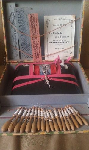 http://tinyurl.com/3du7dgh Antique lace making cushion and bobbins the box (set)