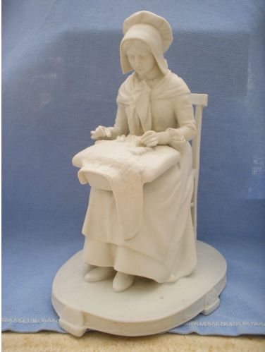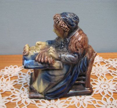 Comments: Small Vlaams Aardewerk lacemaker by Vande Voorde, early 20th century. This is one of the smallest sizes he made (see the LaceNews article on Flemish Pottery lacemakers at http://tinyurl.com/4baktku). Vande Voorde was known for wonderful naturalism in all his figures. This one has two small chips, one in the base, one on a corner of the pillow, otherwise very good condition.
