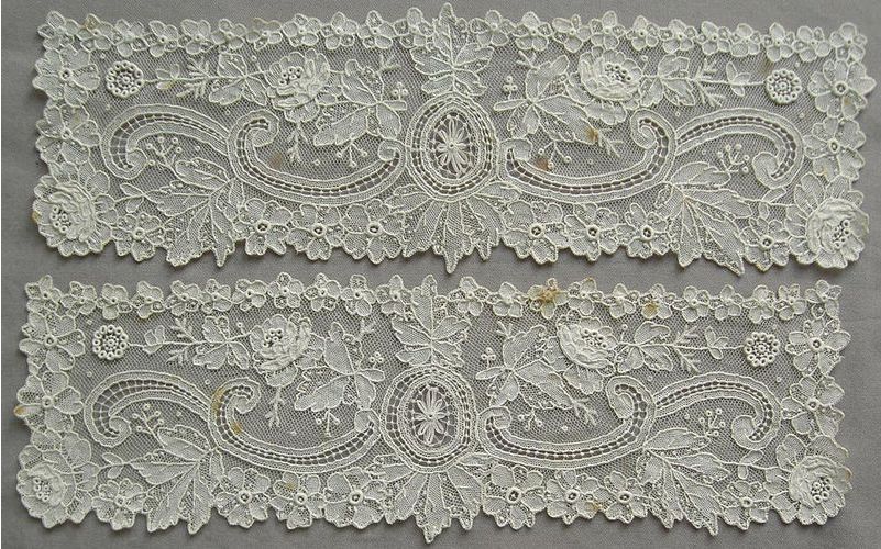 Comments: Good pair of Point de Gaze needlelace cuffs. Four layered petal roses each, raised rings in the centers of flowers, one nice rosette filling. Fairly conventional design. Aside from some brown spotting in places on both, they look in very good condition.