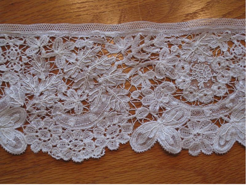 Comments: Big enough for a bertha. I like this a lot, Flemish pieced lace with big bold motifs and lots of varied fillings, and nice picoted bride work.. Condition looks very good, I can’t see anything wrong. Someone put some thought into this one.