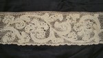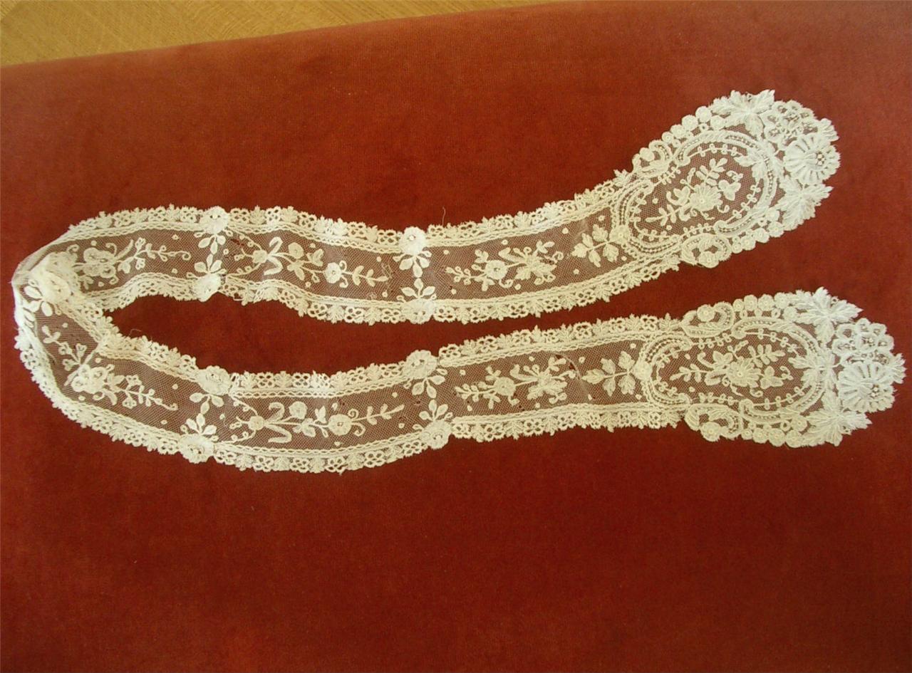 Comments: A good tie with lappet ends of Brussels application on machine net. The bobbinlace motifs have some needlelace accents, mainly raised rings in the centers of flowers (a little like Rosaline perle), and also used a lines of ‘beads’. A pretty typical romantic design. Condition of the net is important in pieces like this, I do see a few small holes and there appear to be a few repairs.