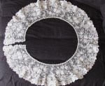 Comments: I agree, it is pretty, and there’s a good reason. This is Belgian 19th c Point d’Angleterre, fine bobbinlace motifs combined with a needlelace point de gaze ground. The work on the many small motifs is lovely. The design is basically a combination of a few simple motifs, giving a kind of diffuse effect of bunches of flowers. There are a number of holes in the net – this would be worth repairing if you can find the thread. These pieces were usually sold in sets, with 2 cuffs and a neckpiece.