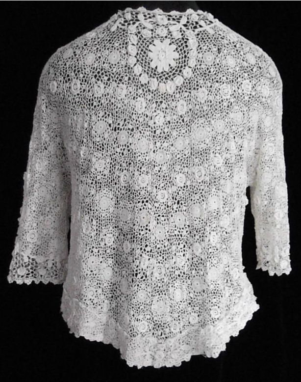 Comments: An Irish Crochet top with a small scale chevron design of Rose of Sharon and circles, larger motif at the front neckline. That overall design is repeated in the sleeves, with nice large motif cuff ends. Hard to guess the date on this one. With something designed for a victorian bustle closer to mid century I’d look for a more bell-shaped sleeve. So it might be a later piece. Condition looks very good, I can’t spot any problems. Photos are rather white, may indicate wash/bleach, but I think it was photographed B/W so it’s hard to tell. Picture below is a back view.