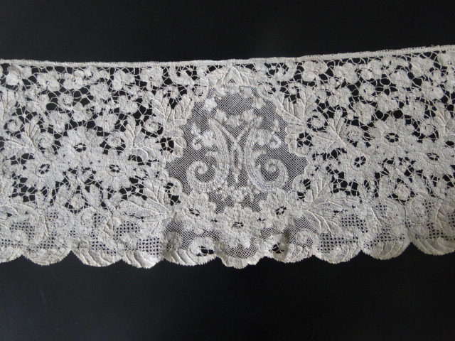 Comments: This must have been a special order with that large monogram. It’s a duchesse, but also seems to have elements of Valenciennes de Gand, with the monogram and flower motifs against the square ground – definitely higher quality. Photos aren’t detailed enough to see how that ground was made. The fillings along the lower edge are also unusual. Other than having been cut almost in half, condition looks very good for the sections shown in the photos. No obvious problems.