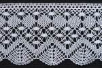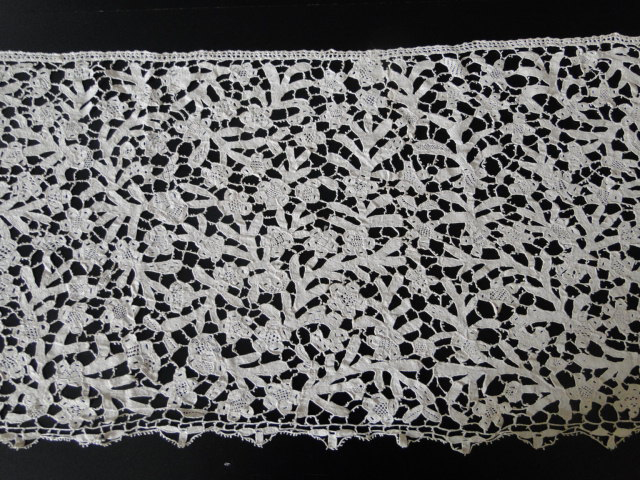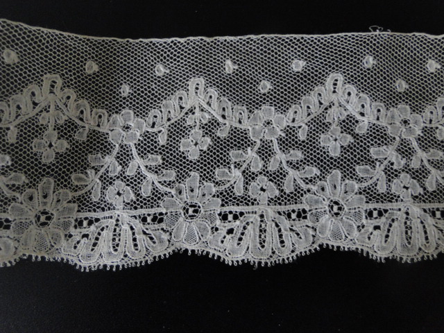 Comments: Point de Gaze flounce of basically flat design – no raised petals. I like the irregular bottom edge, below the strapwork. It does have some condition issues, a fair number of small holes in the ground. Seller cites some fraying and discoloration, although these aren’t so obvious from the photos.